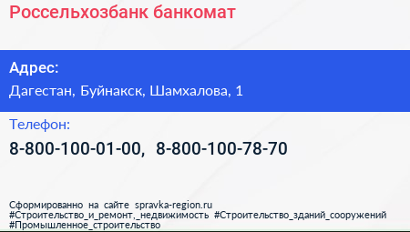 Россельхозбанк, банкомат по адресу Дагестан, Буйнакск, Шамхалова, 1 в дальнейшем Организация, размещена в следующих категориях: