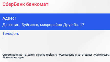 СберБанк, банкомат по адресу Дагестан, Буйнакск, микрорайон Дружба, 17 в дальнейшем Организация, размещена в следующих категориях:
