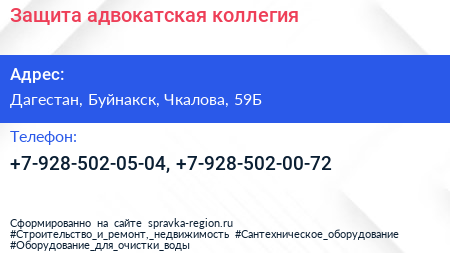 Защита, адвокатская коллегия по адресу Дагестан, Буйнакск, Чкалова, 59Б в дальнейшем Организация, размещена в следующих категориях:
