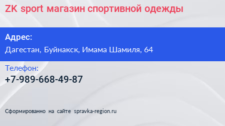 ZK sport, магазин спортивной одежды по адресу Дагестан, Буйнакск, Имама Шамиля, 64 в дальнейшем Организация, размещена в следующих категориях: