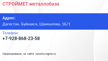 СТРОЙМЕТ, металлобаза по адресу Дагестан, Буйнакск, Шамхалова, 1Б/1 в дальнейшем Организация, размещена в следующих категориях: