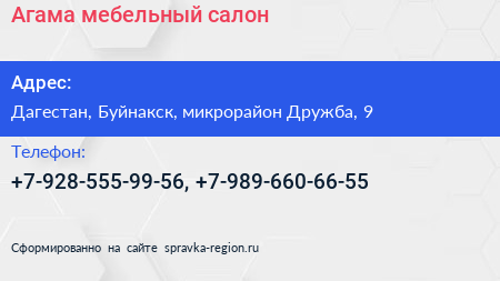Агама, мебельный салон по адресу Дагестан, Буйнакск, микрорайон Дружба, 9 в дальнейшем Организация, размещена в следующих категориях: