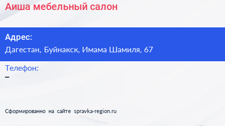 Аиша, мебельный салон по адресу Дагестан, Буйнакск, Имама Шамиля, 67 в дальнейшем Организация, размещена в следующих категориях: