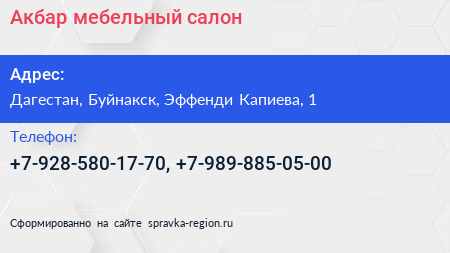 Акбар, мебельный салон по адресу Дагестан, Буйнакск, Эффенди Капиева, 1 в дальнейшем Организация, размещена в следующих категориях: