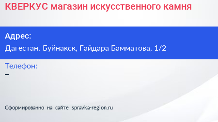 КВЕРКУС, магазин искусственного камня по адресу Дагестан, Буйнакск, Гайдара Бамматова, 1/2 в дальнейшем Организация, размещена в следующих категориях:
