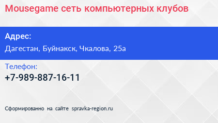 Mousegame, сеть компьютерных клубов по адресу Дагестан, Буйнакск, Чкалова, 25а в дальнейшем Организация, размещена в следующих категориях: