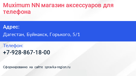 Muximum NN, магазин аксессуаров для телефона по адресу Дагестан, Буйнакск, Горького, 5/1 в дальнейшем Организация, размещена в следующих категориях: