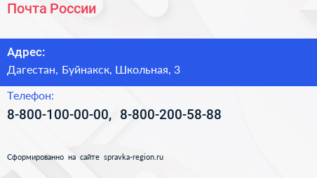 Почта России по адресу Дагестан, Буйнакск, Школьная, 3 в дальнейшем Организация, размещена в следующих категориях: