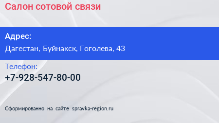 Салон сотовой связи по адресу Дагестан, Буйнакск, Гоголева, 43 в дальнейшем Организация, размещена в следующих категориях: