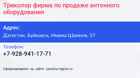 Триколор, фирма по продаже антенного оборудования по адресу Дагестан, Буйнакск, Имама Шамиля, 57 в дальнейшем Организация, размещена в следующих категориях:
