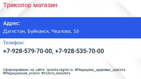 Триколор, магазин по адресу Дагестан, Буйнакск, Чкалова, 16 в дальнейшем Организация, размещена в следующих категориях: