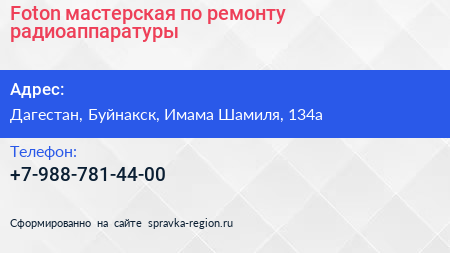 Foton, мастерская по ремонту радиоаппаратуры по адресу Дагестан, Буйнакск, Имама Шамиля, 134а в дальнейшем Организация, размещена в следующих категориях: