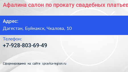 Афалина, салон по прокату свадебных платьев по адресу Дагестан, Буйнакск, Чкалова, 10 в дальнейшем Организация, размещена в следующих категориях: