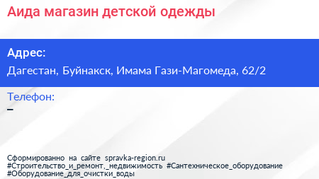 Аида, магазин детской одежды по адресу Дагестан, Буйнакск, Имама Гази-Магомеда, 62/2 в дальнейшем Организация, размещена в следующих категориях: