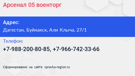Арсенал 05, военторг по адресу Дагестан, Буйнакск, Али Клыча, 27/1 в дальнейшем Организация, размещена в следующих категориях:
