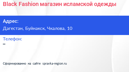 Black Fashion, магазин исламской одежды по адресу Дагестан, Буйнакск, Чкалова, 10 в дальнейшем Организация, размещена в следующих категориях: