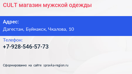 CULT, магазин мужской одежды по адресу Дагестан, Буйнакск, Чкалова, 10 в дальнейшем Организация, размещена в следующих категориях: