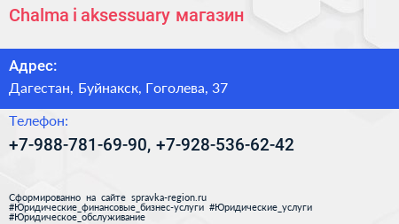 Chalma i aksessuary, магазин по адресу Дагестан, Буйнакск, Гоголева, 37 в дальнейшем Организация, размещена в следующих категориях: