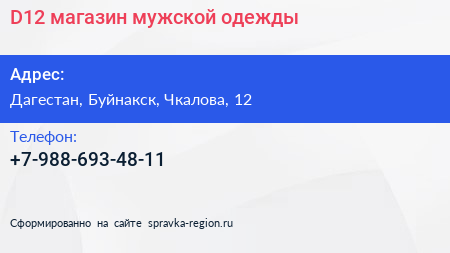 D12, магазин мужской одежды по адресу Дагестан, Буйнакск, Чкалова, 12 в дальнейшем Организация, размещена в следующих категориях: