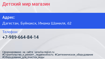 Детский мир, магазин по адресу Дагестан, Буйнакск, Имама Шамиля, 62 в дальнейшем Организация, размещена в следующих категориях: