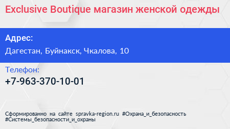 Exclusive Boutique, магазин женской одежды по адресу Дагестан, Буйнакск, Чкалова, 10 в дальнейшем Организация, размещена в следующих категориях:
