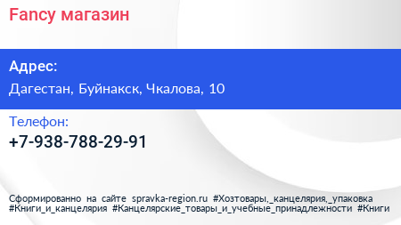 Fancy, магазин по адресу Дагестан, Буйнакск, Чкалова, 10 в дальнейшем Организация, размещена в следующих категориях: