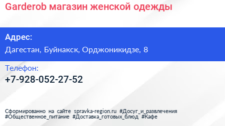 Garderob, магазин женской одежды по адресу Дагестан, Буйнакск, Орджоникидзе, 8 в дальнейшем Организация, размещена в следующих категориях:
