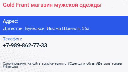 Gold Frant, магазин мужской одежды по адресу Дагестан, Буйнакск, Имама Шамиля, 56а в дальнейшем Организация, размещена в следующих категориях: