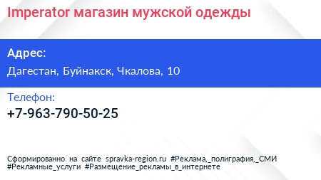 Imperator, магазин мужской одежды по адресу Дагестан, Буйнакск, Чкалова, 10 в дальнейшем Организация, размещена в следующих категориях: