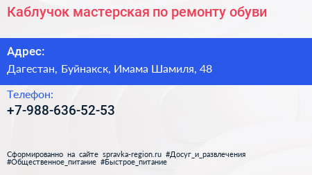Каблучок, мастерская по ремонту обуви по адресу Дагестан, Буйнакск, Имама Шамиля, 48 в дальнейшем Организация, размещена в следующих категориях: