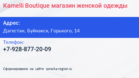 Kamelli Boutique, магазин женской одежды по адресу Дагестан, Буйнакск, Горького, 14 в дальнейшем Организация, размещена в следующих категориях: