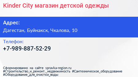 Kinder City, магазин детской одежды по адресу Дагестан, Буйнакск, Чкалова, 10 в дальнейшем Организация, размещена в следующих категориях: