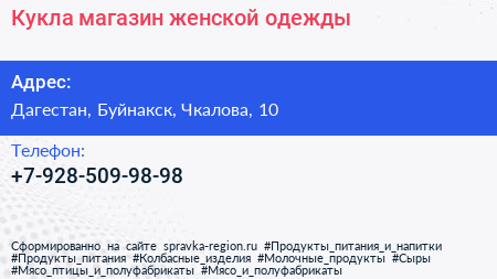 Кукла, магазин женской одежды по адресу Дагестан, Буйнакск, Чкалова, 10 в дальнейшем Организация, размещена в следующих категориях: