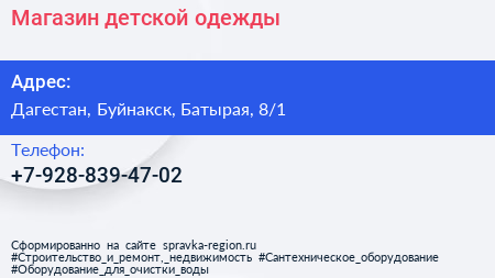 Магазин детской одежды по адресу Дагестан, Буйнакск, Батырая, 8/1 в дальнейшем Организация, размещена в следующих категориях: