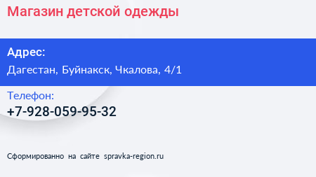 Магазин детской одежды по адресу Дагестан, Буйнакск, Чкалова, 4/1 в дальнейшем Организация, размещена в следующих категориях: