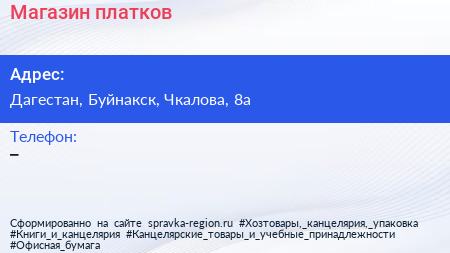 Магазин платков по адресу Дагестан, Буйнакск, Чкалова, 8а в дальнейшем Организация, размещена в следующих категориях:
