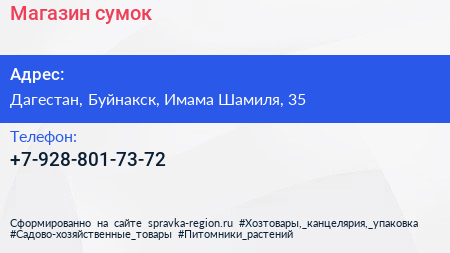 Магазин сумок по адресу Дагестан, Буйнакск, Имама Шамиля, 35 в дальнейшем Организация, размещена в следующих категориях: