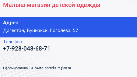 Малыш, магазин детской одежды по адресу Дагестан, Буйнакск, Гоголева, 57 в дальнейшем Организация, размещена в следующих категориях: