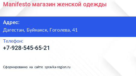 Manifesto, магазин женской одежды по адресу Дагестан, Буйнакск, Гоголева, 41 в дальнейшем Организация, размещена в следующих категориях: