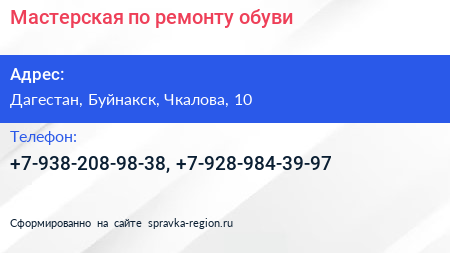 Мастерская по ремонту обуви по адресу Дагестан, Буйнакск, Чкалова, 10 в дальнейшем Организация, размещена в следующих категориях: