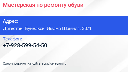 Мастерская по ремонту обуви по адресу Дагестан, Буйнакск, Имама Шамиля, 33/1 в дальнейшем Организация, размещена в следующих категориях:
