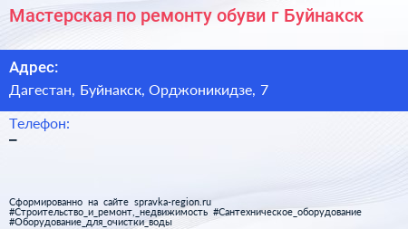 Мастерская по ремонту обуви, г. Буйнакск по адресу Дагестан, Буйнакск, Орджоникидзе, 7 в дальнейшем Организация, размещена в следующих категориях: