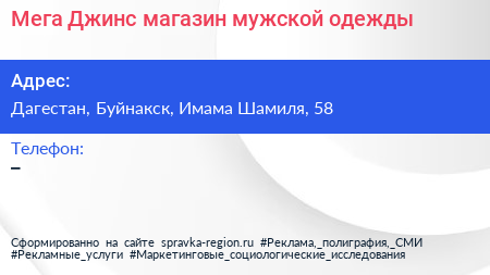 Мега Джинс, магазин мужской одежды по адресу Дагестан, Буйнакск, Имама Шамиля, 58 в дальнейшем Организация, размещена в следующих категориях: