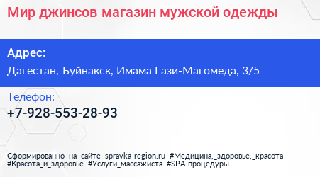 Мир джинсов, магазин мужской одежды по адресу Дагестан, Буйнакск, Имама Гази-Магомеда, 3/5 в дальнейшем Организация, размещена в следующих категориях: