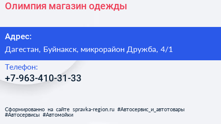 Олимпия, магазин одежды по адресу Дагестан, Буйнакск, микрорайон Дружба, 4/1 в дальнейшем Организация, размещена в следующих категориях: