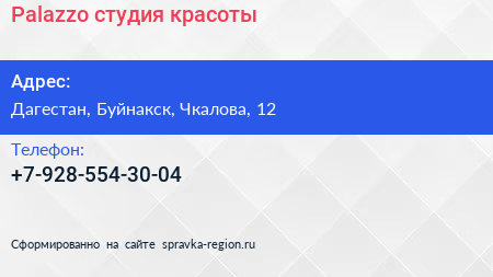 Palazzo, студия красоты по адресу Дагестан, Буйнакск, Чкалова, 12 в дальнейшем Организация, размещена в следующих категориях: