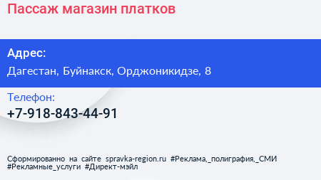 Пассаж, магазин платков по адресу Дагестан, Буйнакск, Орджоникидзе, 8 в дальнейшем Организация, размещена в следующих категориях: