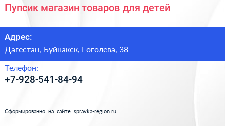 Пупсик, магазин товаров для детей по адресу Дагестан, Буйнакск, Гоголева, 38 в дальнейшем Организация, размещена в следующих категориях: