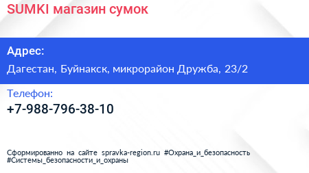 SUMKI, магазин сумок по адресу Дагестан, Буйнакск, микрорайон Дружба, 23/2 в дальнейшем Организация, размещена в следующих категориях: