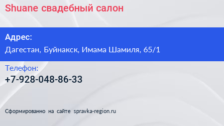 Shuane, свадебный салон по адресу Дагестан, Буйнакск, Имама Шамиля, 65/1 в дальнейшем Организация, размещена в следующих категориях: